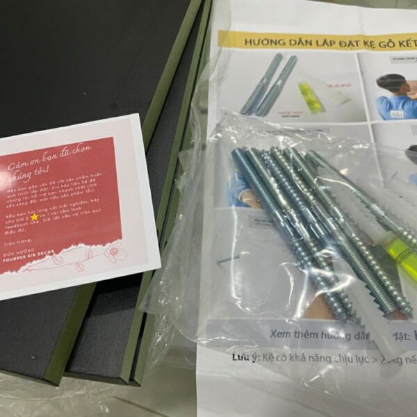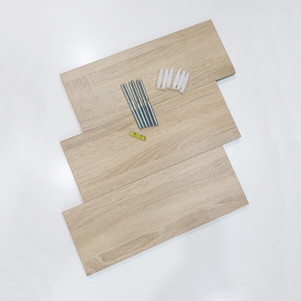Bộ sản phẩm gồm 3 kệ gỗ và đầy đủ phụ kiện (tặng kèm thước thủy lấy thăng bằng khi lắp đặt)