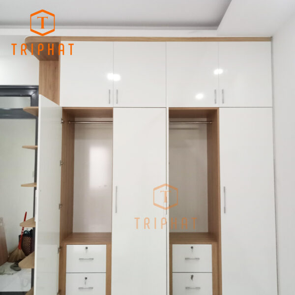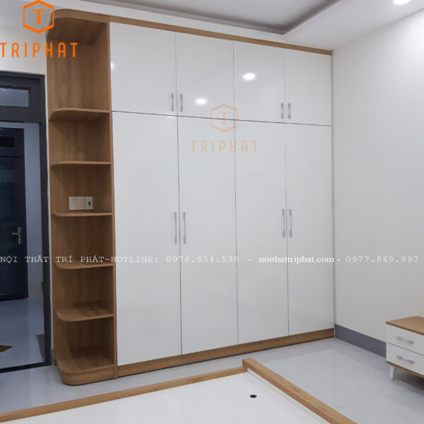 Tủ quần áo: Tủ quần áo nhiều ngắn chứa với chiều cao sát trần và 1 mặt cạnh tủ được thiết kế dưới dạng kệ 4 ngăn dùng để trưng bày các món đồ decor hoặc đồ lưu niệm.