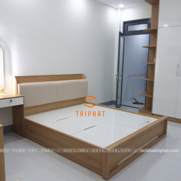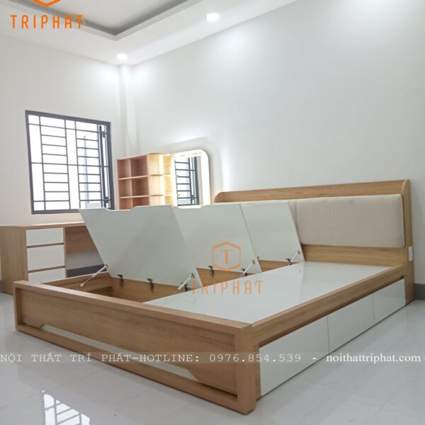 Giường hộp: Thiết kế thêm ngăn kéo chứa đồ. Vừa tối ưu hóa không gian phòng ngủ. Tiết kiệm diện tích và tạo không gian chứa đồ lớn. Vẫn đảm bảo giấc ngủ êm ái cho bạn. Mà còn thăng hạng sự hiện đại, thông minh và tiện nghi cho không gian phòng – Đầu giường bọc nệm êm ái, bạn có thể tựa thoải mái đọc sách, lướt web hàng giờ mà không gây mỏi.